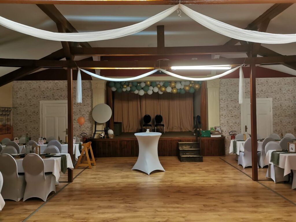 Der Saal bietet Platz für bis zu 80 Personen bei Bankettbestuhlung und kann flexibel nach Bedarf eingerichtet werden – ob mit Tischen, Reihenbestuhlung oder freier Fläche zum Tanzen. Der Saal verfügt über einen separaten Eingang unabhängig von der Gaststätte.